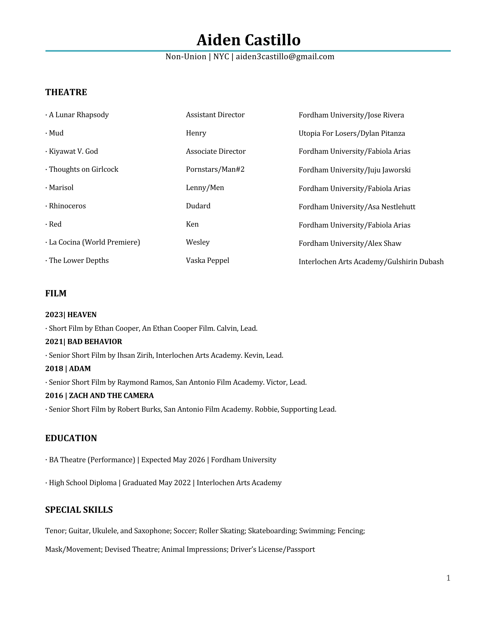 Aiden Castillo is an actor and director from San Antonio, TX. He is a senior at Fordham University’s Lincoln Center campus and a graduate of Interlochen Arts Academy. His work spans contemporary and classical theatre, as well as new play development; he most recently served as Assistant Director for José Rivera’s A Lunar Rhapsody, currently in workshop. He has also collaborated on various films by young filmmakers, including Ethan Cooper’s Heaven. His stage credits include Mud with Utopia for Losers and Othello at Interlochen Shakespeare Festival. Fordham Theatre credits include Marisol, Rhinoceros, Red, and La Cocina (World Premiere). In addition to theatre and film, his passion for music has led to collaborations with artists such as Will For Short and Percbuddy.