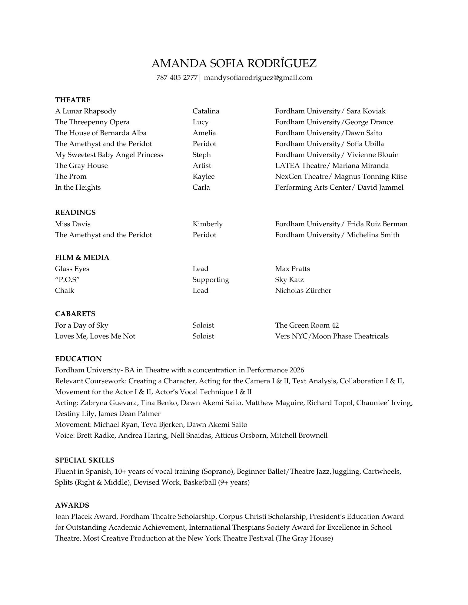 Amanda Sofia Rodríguez is a firecracker who thrives in ensemble-driven work and is drawn to characters who balance confidence and edge with hidden emotional depth. She especially loves to work alongside playwrights developing new work. Her credits at Fordham University include: A Lunar Rhapsody, The House of Bernarda Alba, The Threepenny Opera, The Amethyst and the Peridot, and My Sweetest Baby Angel Princess. She has trained, devised, and performed in New York, Puerto Rico, and Germany and looks forward to continuing to hone her craft across the globe.