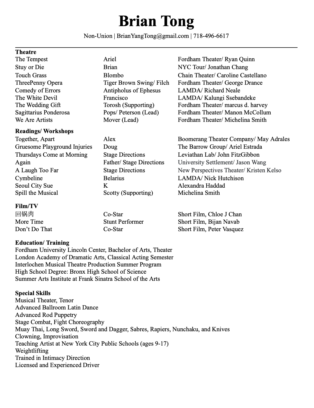 Brian Tong is a beam of sunshine who is committed to bridging the intersection between culture, history, and contemporary issues through performance. With a musical theater background and not believing in limitations, his means of storytelling expands to puppetry, fight choreography, and clowning. He uses his skills to be an advocate for change, educate the youth, inspire passion for creativity, and to prove that no young asian boy should ever be discouraged from chasing their dream in the arts. He has immense gratitude to have been trained at Fordham Theater, London Academy of Music and Dramatic Arts, and Interlochen and since has collaborated with/performed at NAATCO, Transport Group, Classic Stage, The Tank, Theaterlab, New Perspectives, The Chain, The Barrow Group, Leviathan Lab, Boomerang Theater Company, and Family Life Theatre. Learn more about him at brianyangtong.com.