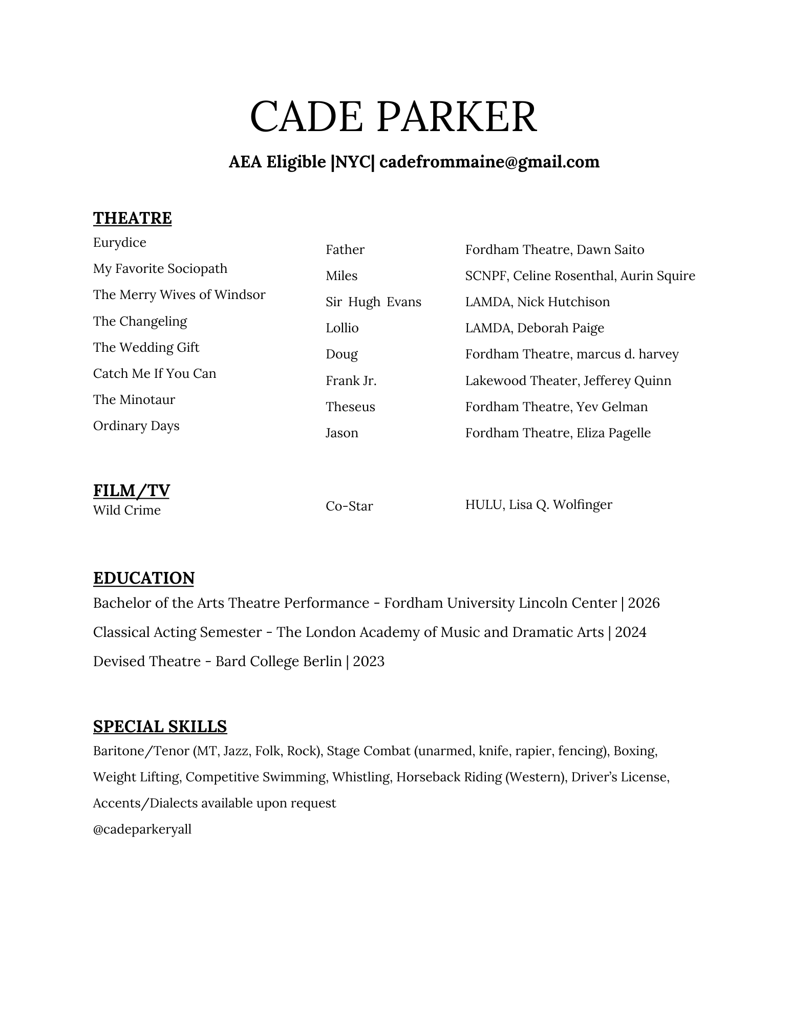 Cade Parker’s curiosity and heart are at the center of everything he does. Born and raised in Maine, it was his discipline as a competitive swimmer where he honed his resilience and humility. Cade further cultivated his artistry in Europe, training and performing in Berlin and at the London Academy of Music and Dramatic Art (LAMDA). Most recent stage credits include Eurydice, My Favorite Sociopath, and The Merry Wives of Windsor.