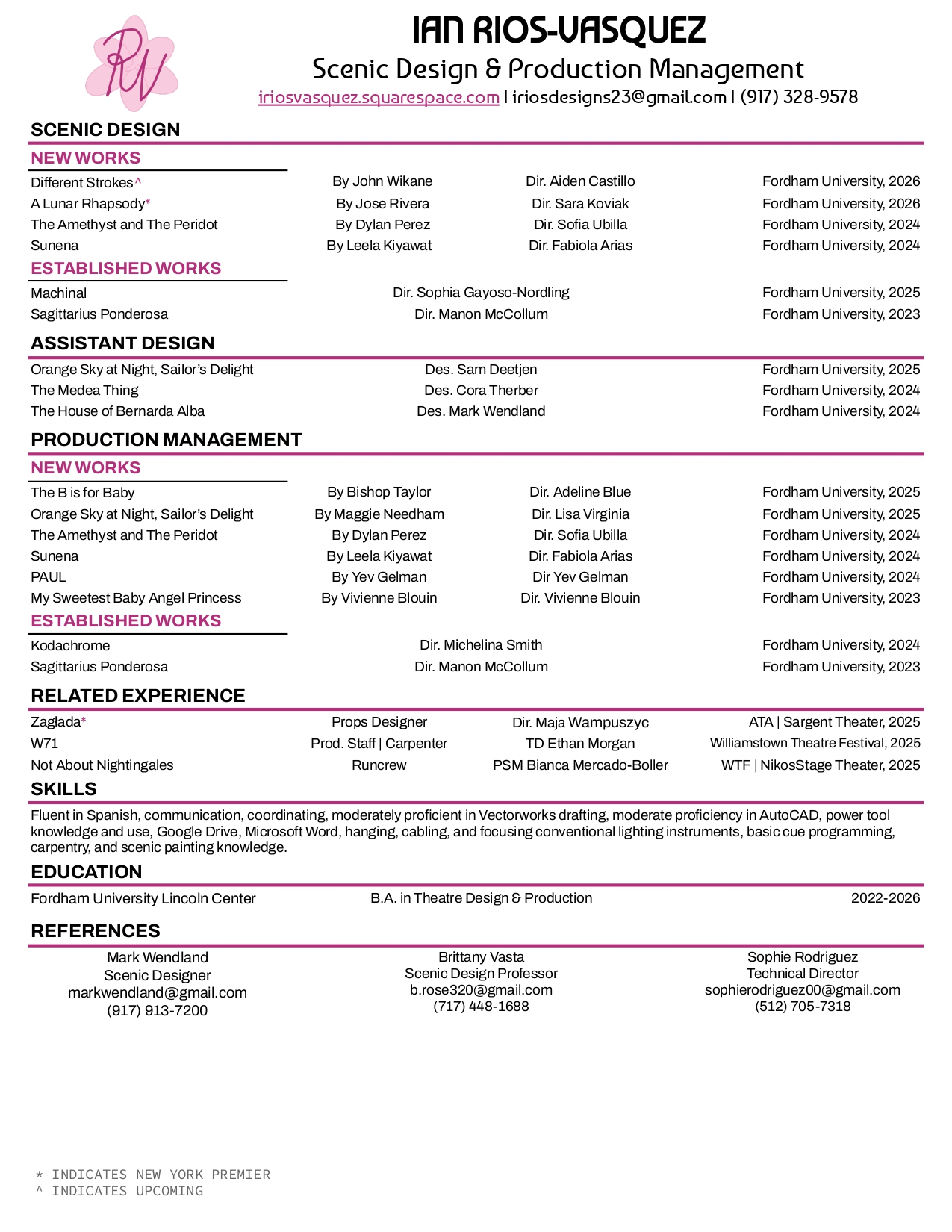 Hey there! My name is Ian Rios-Vasquez, and I am a queer Colombian theatre artist, scenic designer, carpenter, and production manager based in New York City. I love exploring and learning about worlds, both new and old. I want to create art that uplifts voices that go unheard; art that brings smiles, love, and hope into the world. I want to share the joy I get from learning of others’ experiences with the world. Through this act and using theatre as my medium, I see the potential theatre has to foster the blossoming of community. With this community, I aim to help tell as many stories as I can and inspire as many people as I can.