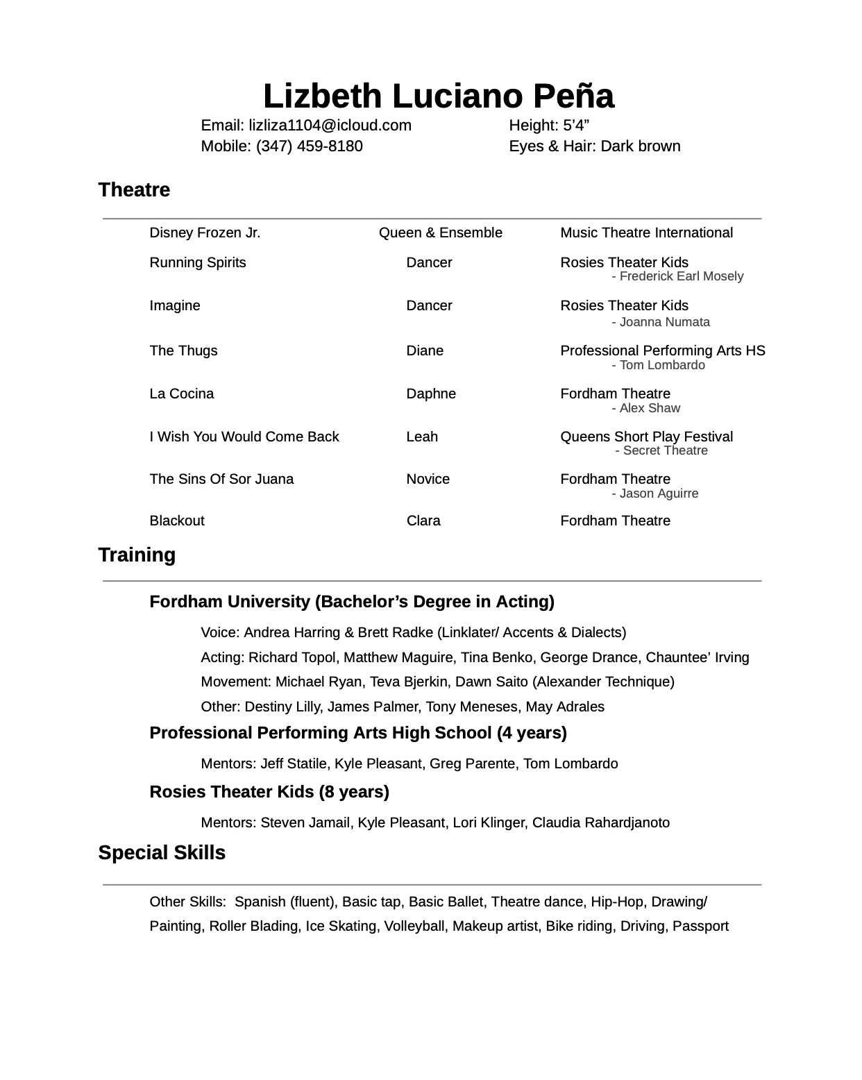A proud daughter of Dominican immigrants, Lizbeth Luciano’s artistry is grounded in discipline and creative expression. Whether mastering a complex dance routine or honing her visual arts skills, Lizbeth channels that same determination into her acting. Her love for theater began early, with formative experiences at Rosie's Theater Kids. She continued to sharpen her craft at the Professional Performing Arts High School, where she studied Musical Theatre. Now a senior at Fordham University’s Department of Theatre, Lizbeth made her debut in the mainstage production of La Cocina as Daphne. Other credits at Fordham include The Sins of Sor Juana (Novice) and Blackout (Clara). Eager to apply her learning, Lizbeth aims to dismantle the racial and gender barriers in Hollywood and become the representation her younger self always needed.